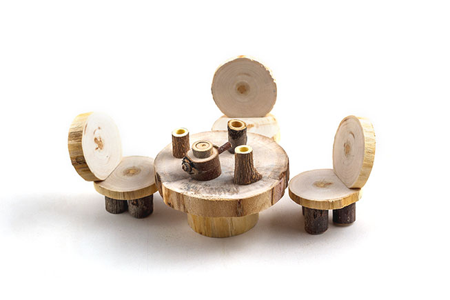 به دلیل استفاده از شاخههای درختی در میز و صندلی اندازههای متفاوتی دارد.